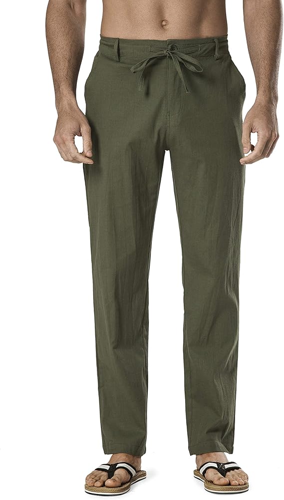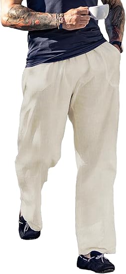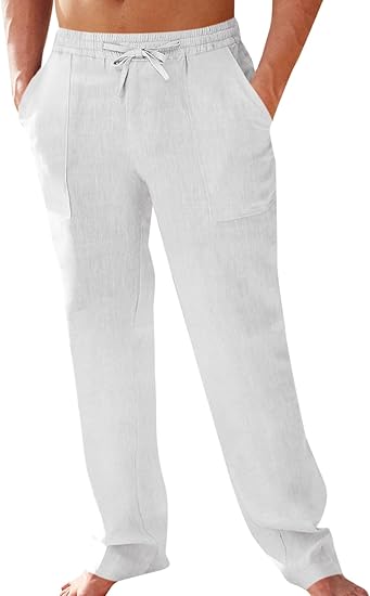 Men's Cotton Linen Pants Elastic Waist Drawstring Casual Trouser Lightweight Straight-Legs Loose Beach Yoga Pants