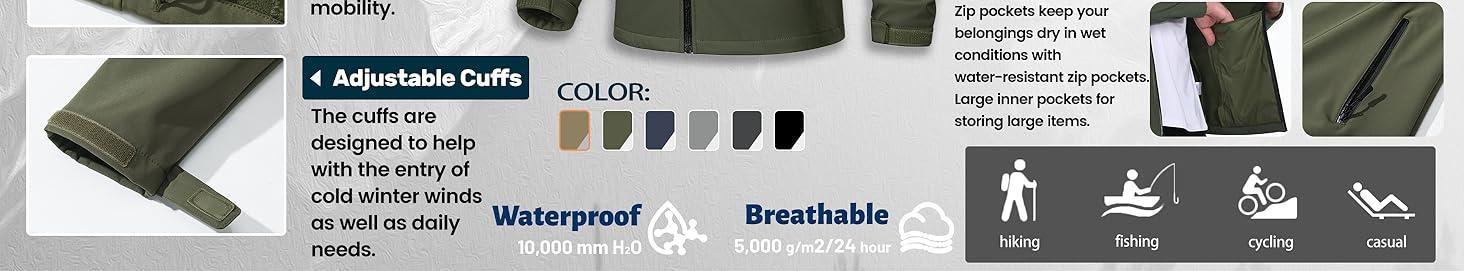 【Fleece-Lined Interior】The smooth, abrasion-resistant softshell fabric has an adjustable hem and cuffs to help protect against the wind and keep you warm inside.The lightweight, comfortable fabric allows for more flexibility in the outdoors. Fleece insulation absorbs heat but still allows air to circulate so you won't overheat.